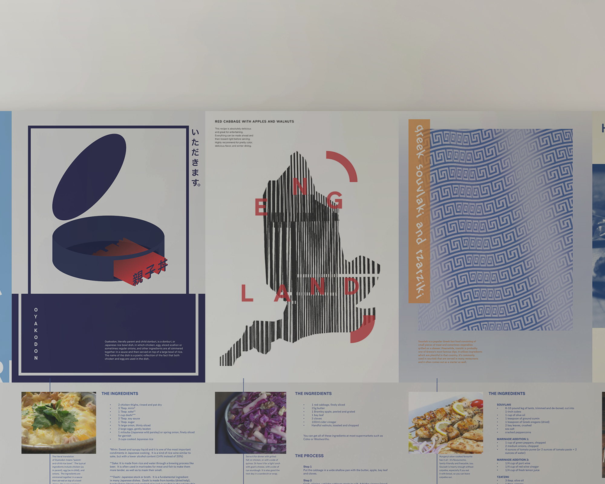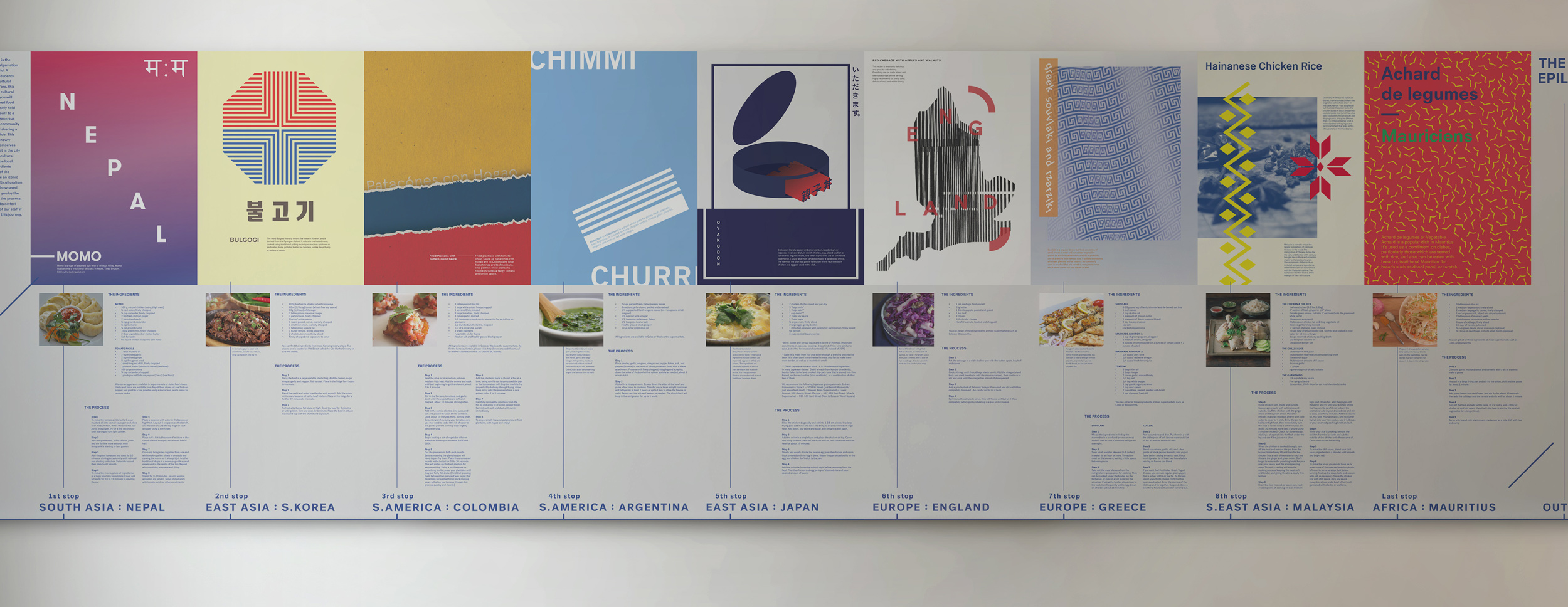 I was asked by Kaplan Business School, Sydney to create a multicultural experience to be displayed at the Student Breakout Area. I have decided to use a series of posters and typography to feature recipes from all over the world to immerse the audience into the distinctive visual elements of each country.