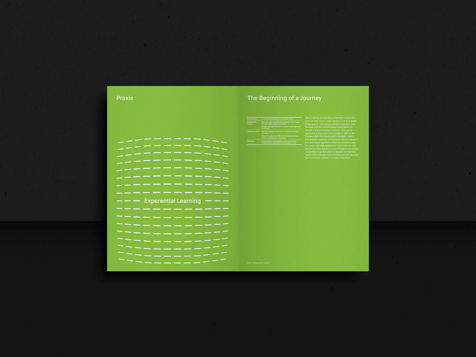 This report is a visual and written rendition of my internship at Mentally Friendly and the experiences that I have gained from it.The report analyses the relationship between the skills and knowledge I have acquired during my internship to academic knowledge and literature. I also described how my academic pursuit has helped me excel as an intern designer. It discusses my responsibilities as an intern, the skills acquired, my expectations, and what studio life is all about as a junior graphic designer.